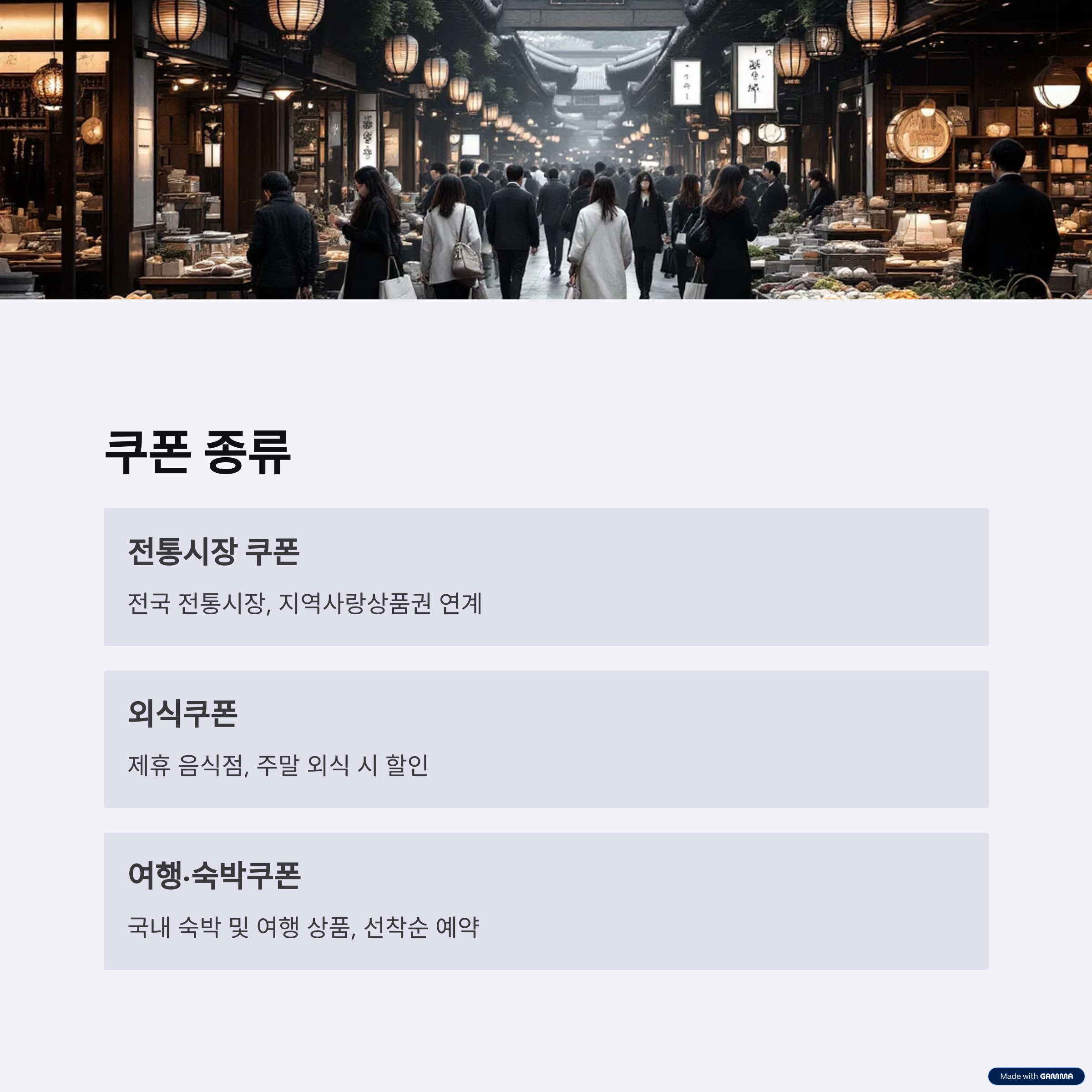 | 전통시장 쿠폰 | 전국 전통시장 | 지역사랑상품권 연계 |