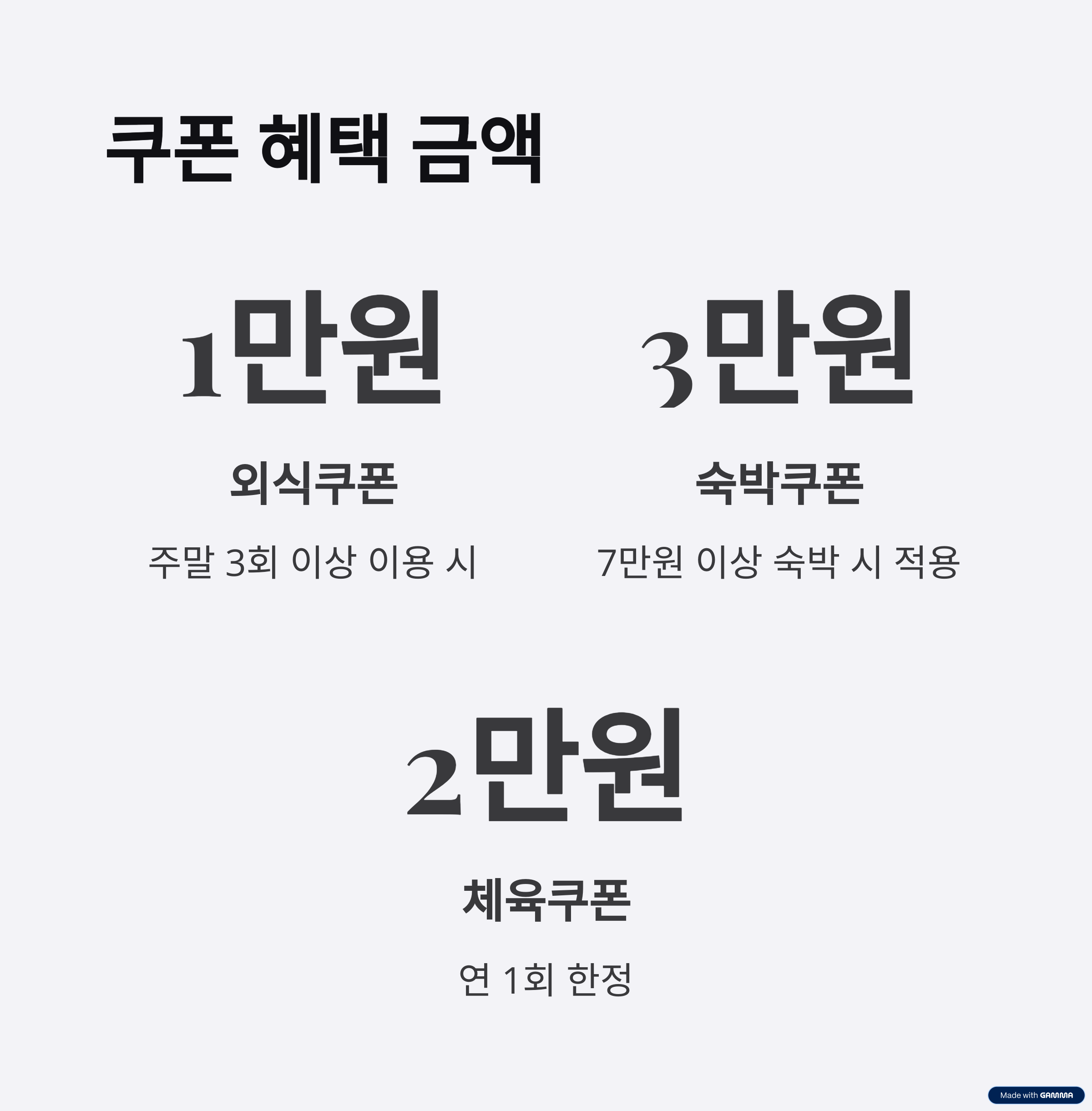 | 외식쿠폰 | 1만 원 할인 | 주말 3회 이상 이용 시 |