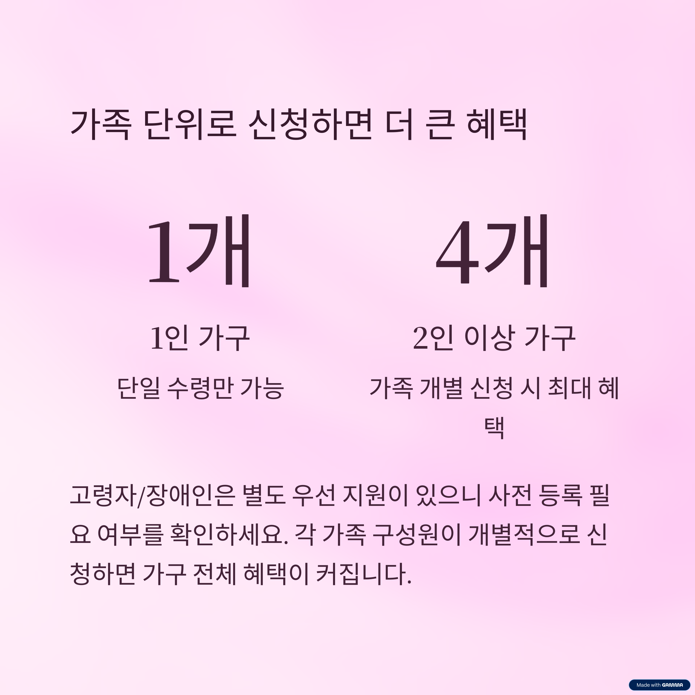 | 2인 이상 가구 | 최대 4개까지 가능 | 가족 개별 신청 시 |